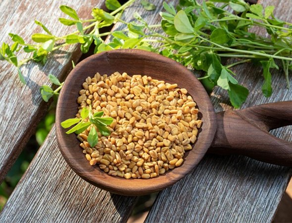 Fenugreek (Trigonella foenum-graecum) is a herb widely used both as a spice and a medicinal plant. It has small, yellowish-brown seeds and leaves that are also edible. Used whole or ground as a spice in Indian, Middle Eastern, and North African cuisines. They have a slightly bitter, nutty flavor and aroma somewhat like maple syrup. Known for benefits like aiding digestion, controlling blood sugar, and boosting milk production in breastfeeding